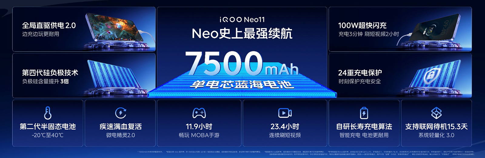 Neo11 实现 Neo 史上最强续航表现,搭载配备了第二代半固态电池技术和第四代硅负极技术的 7500mAh 超薄蓝海电池,即使在 -20℃ ~ 40℃ 的环境中,依然能稳定持久放电,并配备 100W 超快闪充且支持 PPS 和 PD 快充协议,让充电更自在;全新升级的全局直驱供电 2.0,支持智能温控,做到发热更低、损耗更少,有效延缓电池老化,边充边玩也安心。