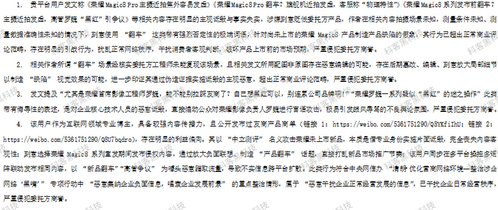 产品问题解决不了,那就解决提出问题的人?!来来来,看看荣耀团队做的“好事”!近期科技网站科客反馈的荣耀Magic8 Pro近拍发虚问题,荣耀不是积极解决问题,而是在各平台疯狂恶意投诉,无所不用其极,欺人太甚!