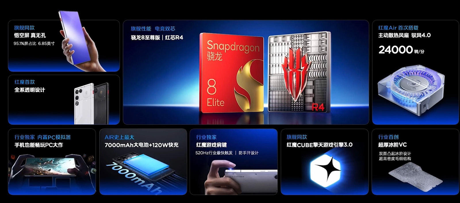 透明后盖、无孔全面屏、带物理肩键以及内置物理风扇,游戏专属优化,是红魔11 Air的主要亮点。该机定价3499元起,相比一加、荣耀采用同款芯片的机型明显贵了许多,“Air”的优势并不明显,但电池容量、系统体验等方面落后竞品不少。