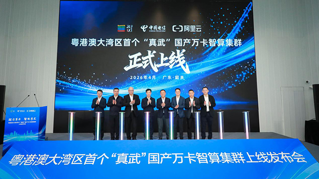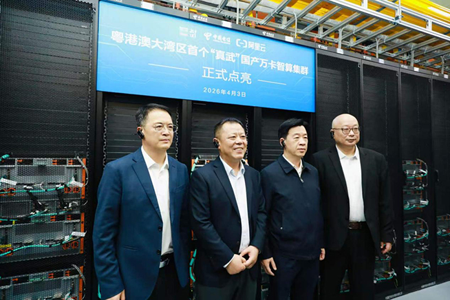 4月3日,由中国电信广东公司联合阿里云共同建设的粤港澳大湾区首个基于“真武”芯片的万卡智算集群,在韶关数据中心集群正式上线。作为国家“超大规模智算集群”新基建在大湾区的首个落地项目,该集群实现了从芯片、云平台到模型应用的全链路自主研发,标志着自研先进算力正从高端性能突破加速迈向产业应用与算力普惠。韶关市委书记陈少荣,市委副书记、市长吴庆华,阿里云智能集团资深副总裁李津,中国电信广东公司总经理张涛、副总经理王湘江出席活动。