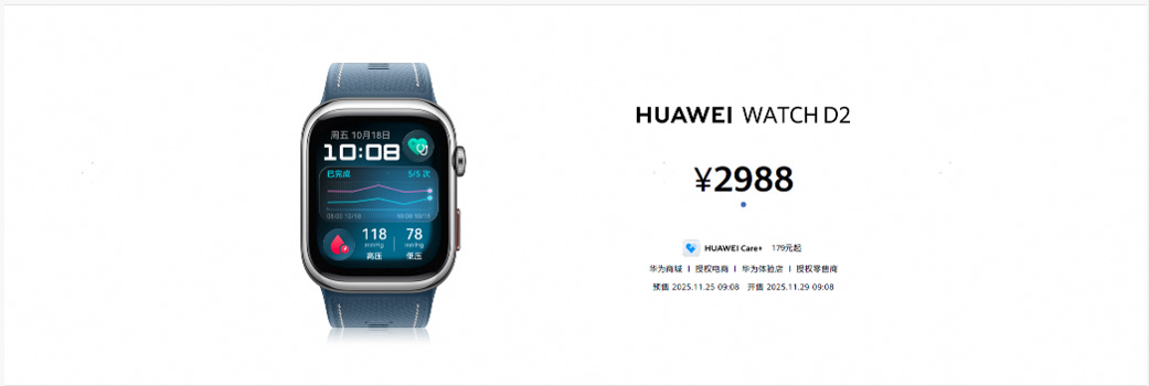 目前,HUAWEI WATCH D2已全面开启预售,2025年11月28日正式开售,售价2988元。