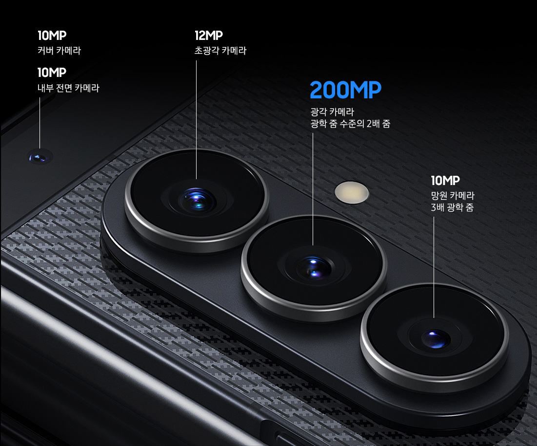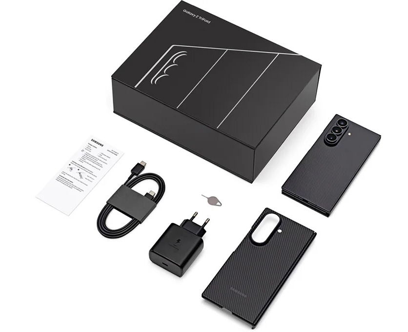 在手机背面,三星Galaxy Z TriFold选用陶瓷玻纤背板,加入凯夫拉纹理,整体气质更沉稳,只可惜仅有黑色版本销售。该机后置三摄的Deco风格与三星Galaxy Z Fold7一致,2亿像素主摄采用F1.7大光圈和OIS光学防抖,1200万像素直立式3x长焦同样带OIS光学防抖,光圈F2.2,1000万像素超广角镜头FOV为120度。此外,三星Galaxy Z TriFold内外屏都还有1000万像素的自拍摄像头。