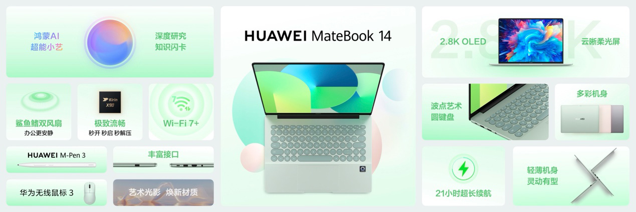 HUAWEI MateBook 14 鸿蒙版也在此次发布会上正式亮相。该产品部分配置搭载2.8K OLED云晰柔光屏,采用波点艺术键盘,为用户提供全新选择。采用金属一体化机身设计,机身薄至14.5mm、重约1.33kg,轻薄便携。软硬芯云协同及方舟引擎的加持,带来更流畅的整机体验。70Wh电池配合华为智能低功耗平台带来更持久的续航体验。